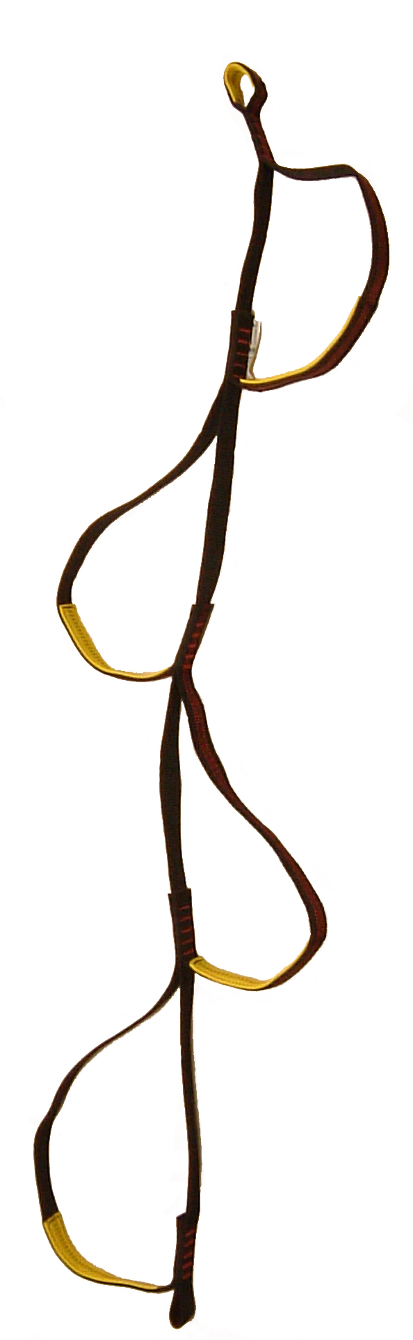 25mm wide four step nylon tape etrier with reinforced foot stirrups & top eye loop. Eye-loop on bottom offers potential to extend.