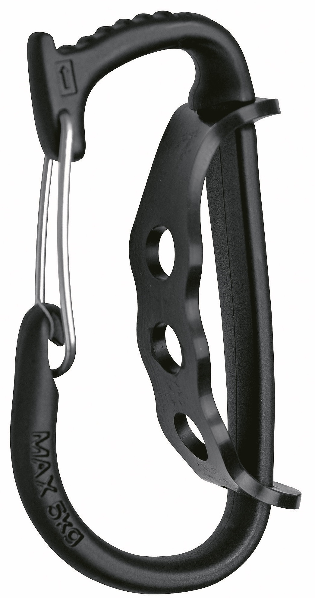 Singing Rock Porter Plastic Holder K9000BB03, complete with retention rubber and wire gate (23mm gate opening). Plastic holder for racking ice screws, pitons and industrial tools on the harness.