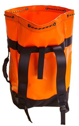17.5ltr (closed) Rucksack styled Tackle / Rope Bag with also a moulded rubber handle. Orange coloured Medium weight PVC construction for the main body. Draw cord & cord lock closure. Size: H 450mm, Base 270mm x 170mm with 3 drain holes in base. The shoulder straps are of web construction with also a quick release buckle on left shoulder strap. Present are also a rope tie-in loop at top hem & 2 hauling loops. The base is reinforced with a hardwearing texturised nylon.