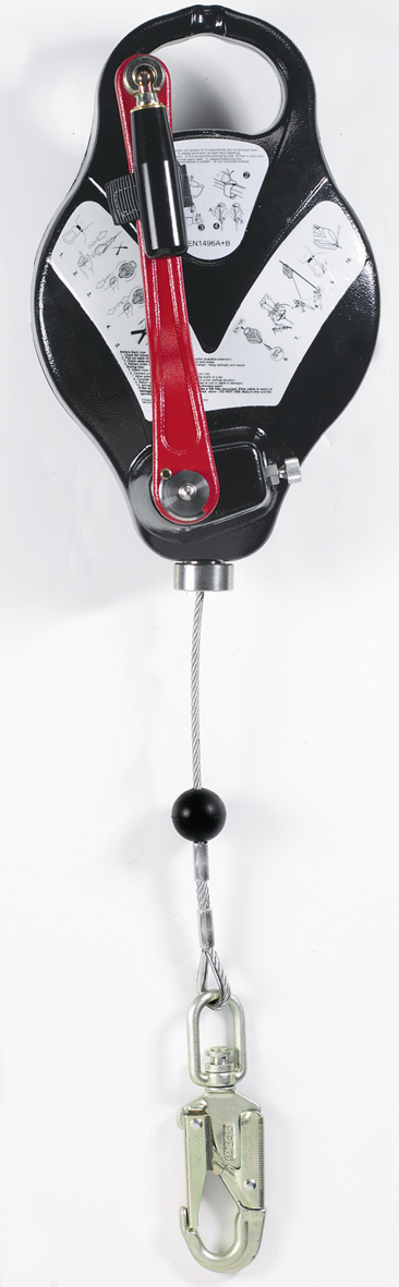 15m Fall Arrest & Rescue Retrieval Recovery Block c/w fold-out stabilising handle for easier handling in winch mode when it is not mounted on a tripod leg. 5mm dia. galv. steel wire with a steel double action snap hook (& integral fall indicator). Can be used as a standard self retracting fall arrest block, but in the event of a fall & / or an incapacitated user, the operative can then be winched to safety. Requires a top anchorage EN362 connector (supplied separately) when it is not mounted on a tripod leg. CE marked to EN360 & tested in accordance with EN1496 A&B. Weight 11.35kg. SWL 136kg.