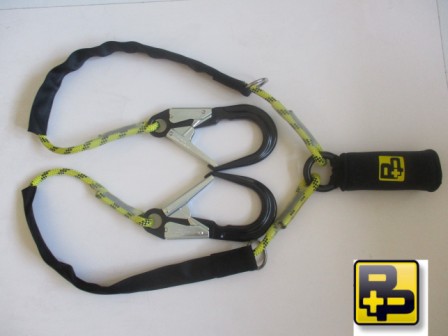 1.5m Shortie energy absorbing 2 tails fall arrest lanyard c/w Triplock Karabiner. A wear sleeve and choking ring to be fitted to each tail. A large aluminium double action snap hook (90249) fitted to the end of each tail