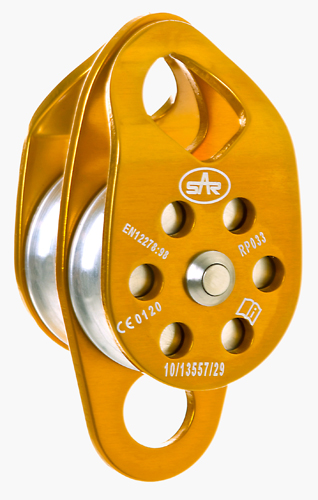 SAR Lightweight Swing Cheek Rescue Double Pulley with 50mm dia. alloy sheaves. Colour varies can be black or gold. This compact lightweight pulley is suitable either as a component of a hauling system or for use with twin rope Tyrolean traverses. For use with textile ropes between 10mm and 12.7mm dia. The sheaves are fitted with self-lubricating Oilite bushings. Weight 288g. EN12278: 1998. Individually tested. Unique serial number on each unit. WLL 1.5kN x 4 = 6kN. MBL 7.5kN x 4 = 30kN.