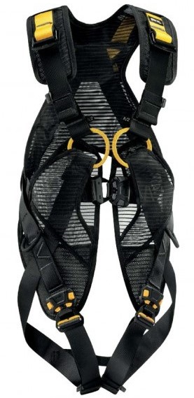 Fall arrest attachment points on the front (Sternal) and back (Dorsal). The harness also has two work positioning attachment points and a personal suspension point (Ventral point) on the waist. The harness will be adjustable to fit a range of sizes, with adjustment buckles on the shoulders, waist and leg loops.