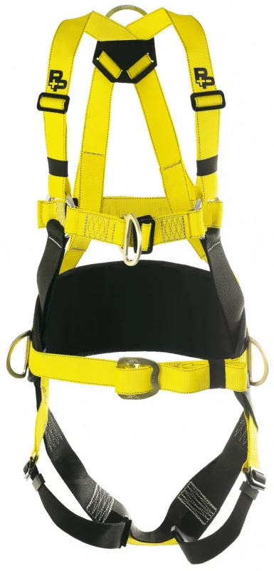 Fall arrest attachment points on the front (Sternal) and back (Dorsal) of this type of harness. The harness also has two work positioning attachment points on the waist. The harness will be adjustable to fit a range of sizes, with adjustment buckles on the shoulders, waist and leg loops.