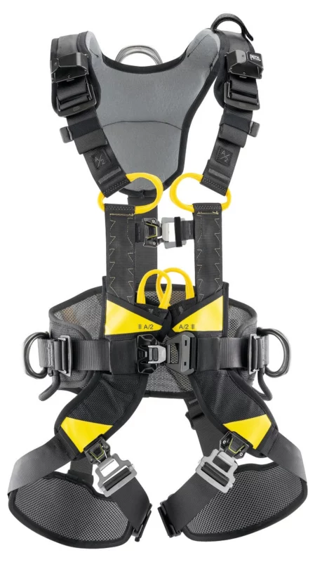 A 2 point harness will have fall arrest attachment points on the front (Sternal) and back (Dorsal). The harness will be adjustable to fit a range of sizes, with adjustment buckles on the shoulders and leg loops.